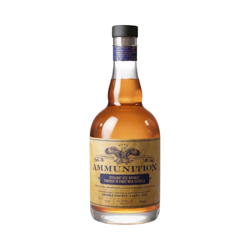 Savor the rich butterscotch, rye spice, hints of vanilla and caramelized citrus of this truly unique rye. This dark amber whiskey has a nice round finish with subtle notes of red berries and baking spice. We use a blend of 3- and 4-year-old Rye Whiskey, finished for 6 months in French Burgundy wine barrels which previously held Ammunition Russian River Pinot Noir. 45.0% ABV