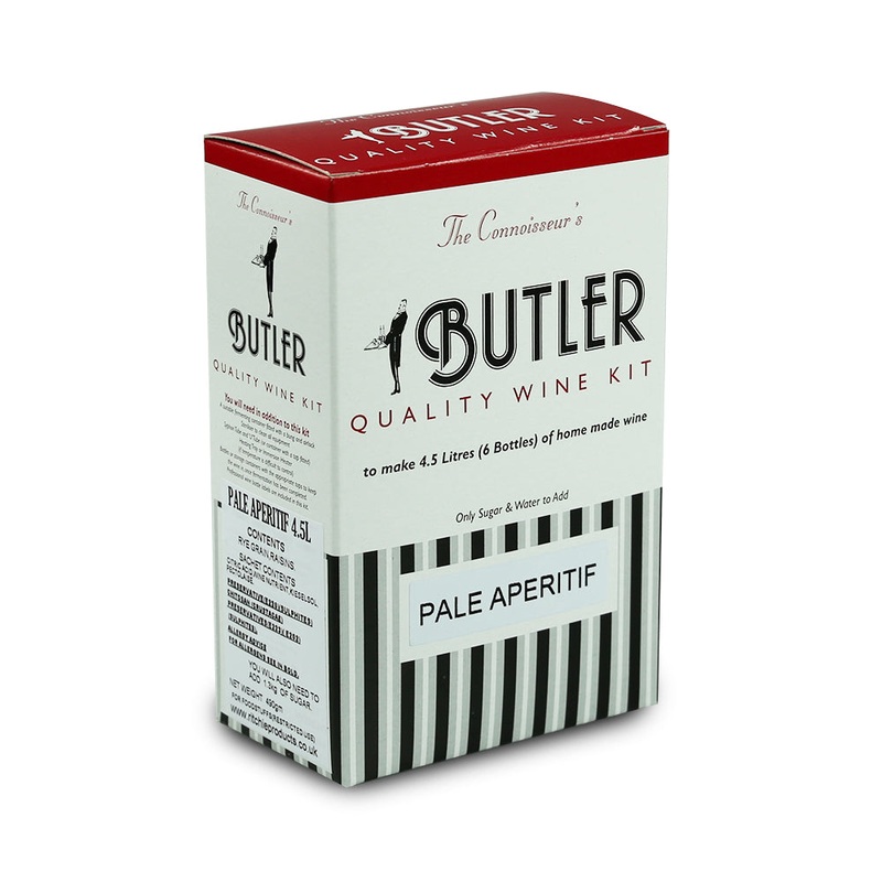 Butler ConnoisseurPale Aperitif Wine Kits will make 6 bottles ofSherry style wine in approx. 28 days and will ferment out to approx. 18% ABV.These are ingredients only kits and no equipment is supplied. You'll also need 1.3kg ofsugar. For best results we r