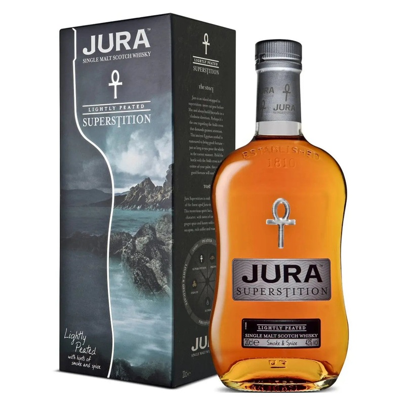 The Jura distillery on the island of Jura was rebuilt in 1963. In Superstition, the owners wanted to produce a wild whisky that's as rich as the Jura story and a testament to all the intriguing histories around the world, so they added the ancient Ankh cro