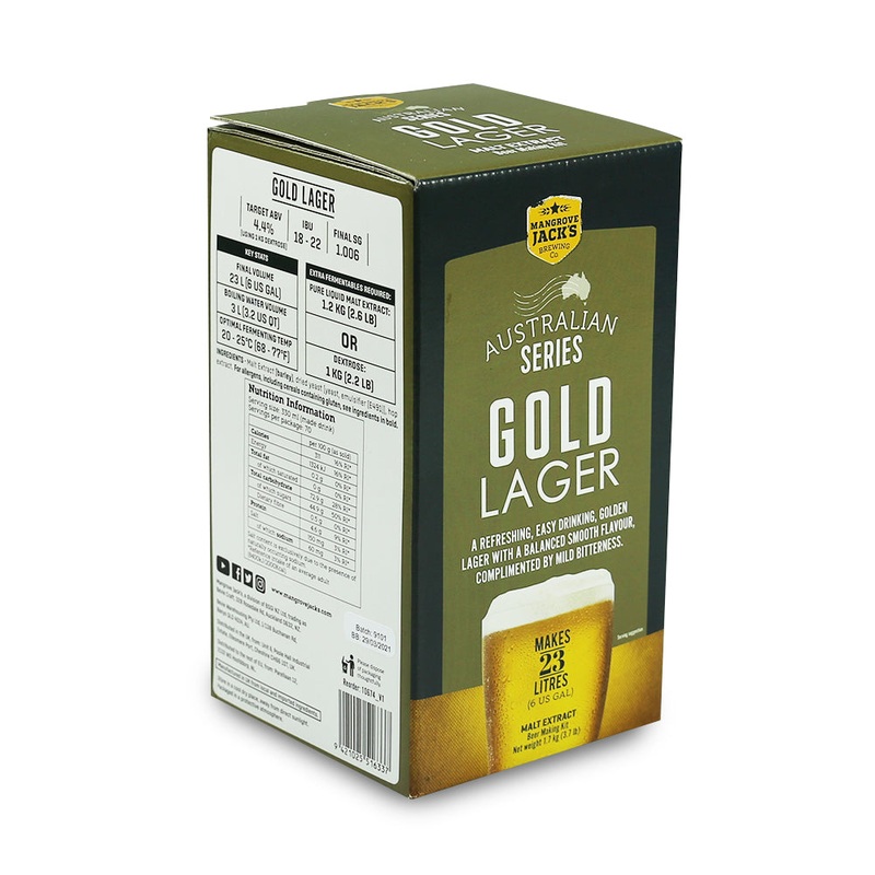 A refreshing, easy drinking, golden lager with a balanced smooth flavour, complimented by mild bitterness.Weight: 1.7kgBrewing Volume: 40 pints/23 litresABV Approx (% Vol): 4.4%Colour: Vibrant GoldIBU: 18-22Requires 1.2kg Mangrove Jacks Pure Liquid Malt Ex